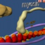 In another virtual reality world you closely examine the structure of the myosin molecules and how they deform after obtaining energy from the ATP. The whole sequence with actin, tropomyosin, calcium binding troponin and finally the myosin molecule walking on the actin filament is shown in another 3D scene.